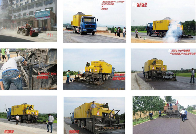 稀漿封層工藝原理是將乳化瀝青、符合級配的骨料、水、填料及添加劑按一定的設計配比攪拌成稀漿混合料,均勻地攤鋪在待處理的路面上,經裹復、破乳、析水、蒸發和固化等過程與原路面牢固地結合在一起,形成密實、堅固、耐磨和道路表面封層,大大提高路面使用性能。