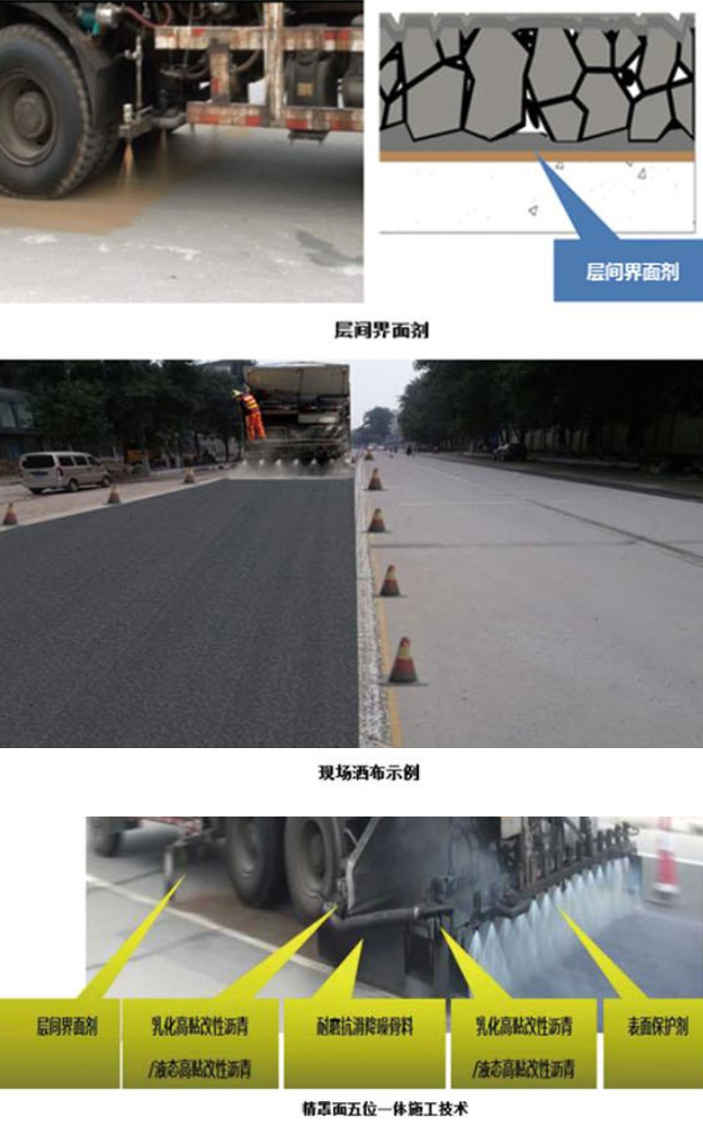 依據界面化學原理所開發,含有表面活性劑、高分子粘結劑和瀝青再生劑或水泥增強劑等材料,層間界面劑分瀝青路面專用和水泥路面專用。增強對原路面層間界面劑的滲透,再生老化瀝青、激活老化瀝青的粘彈性或補強水泥,提高層間粘結力,25°C拉拔試驗粘結強度≥1.0MPa,能夠防止片狀脫落,促進新養護層更好的與基層結合,同時能將粉化的路面及其粉塵進行有效裹覆,從而提高新養護層與基面的粘結能力。