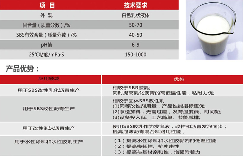乳狀液體SBS,具有良好的儲(chǔ)存穩(wěn)定性和流動(dòng)性,用于SBS改性乳化瀝青、SBS改性瀝青、SBS改性泡沫瀝青、水性涂料和水性粘合劑的生產(chǎn)。
